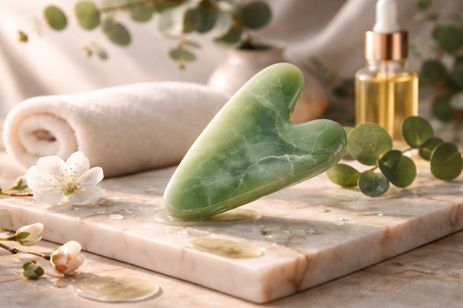 Gua sha is a traditional skincare tool that uses a smooth, flat stone to gently massage the face, helping to boost circulation, promote lymphatic drainage, and enhance a naturally sculpted, radiant appearance.